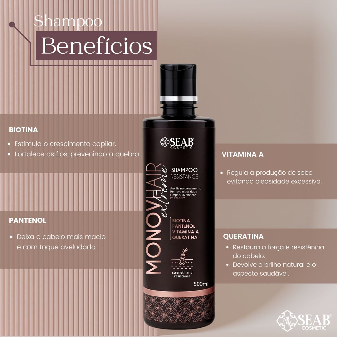 Sugestão de Uso: Aplique sobre os cabelos molhados, massageando o couro cabeludo suavemente com as pontas dos dedos para estimular a circulação e a absorção dos ativos. Enxágue e, para resultados máximos, utilize em conjunto com a Máscara Resistance Monovhair Extreme.
