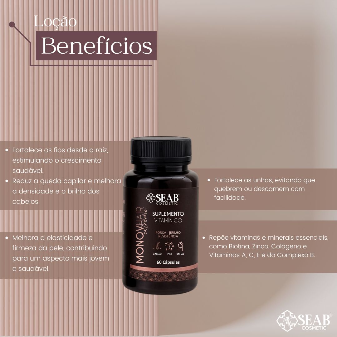 O Suplemento Vitamínico Monovhair Extreme é o aliado perfeito para quem busca um tratamento completo de beleza e saúde. Atuando de dentro para fora, ele fornece os nutrientes essenciais para potencializar os resultados da linha capilar, garantindo benefícios para cabelos, pele e unhas.